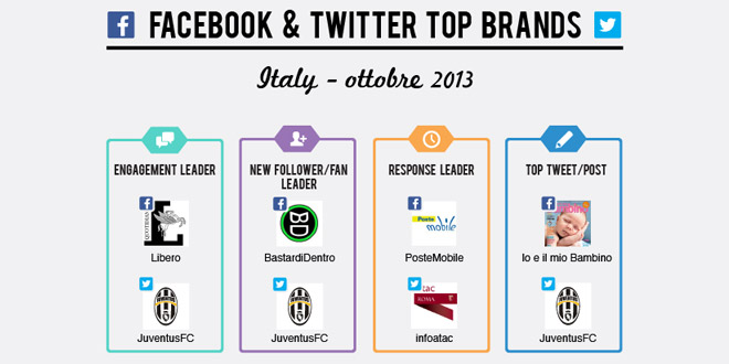 Per il mese di Ottobre 2013 Blogmeter ci propone una classifica unitaria che ci mostra i 10 migliori brand su Facebook e su Twitter, Libero si impone per engagement su Facebook, mentre JuventusFC lo è su Twitter ed è anche il brand che registra più nuovi followers. BastartiDentro invece è quello che acquisisce più nuovi fans su Facebook. Ma vediamo in dettaglio le classifiche
